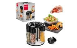 Spice-8 Gewürzständer schwarz oder weiss. Drehständer mit Griff und 8 luftdicht verschließbaren Glas-Behältern in 2 unterschiedlichen Größen (4 x 88 ml und 4 x 72 ml). Inklusive 16 austauschbaren Streueinsätzen (4 x fein, 4 x grob, 8 x mittel) und 12 selbstklebenden Etiketten.
