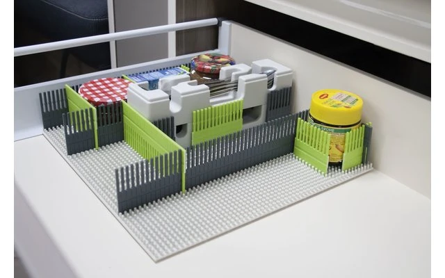 Einfach auf die Noppenplatte aufstecken, um verschiedene Gläser, Flaschen, Haushaltsartikel, Campingzubehör bruch- und kippsicher zu verstauen. Die Noppenplatte ist passgenau auf die Stauleisten konzipiert und bietet in ihrer Eigenschaft für fast jede Fachgröße eine platzsparende Lösung.