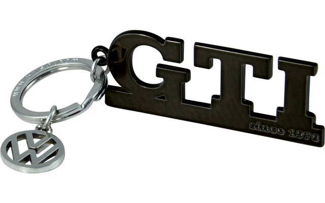 Schlüsselanhänger als GTI Schriftzug mit VW Charm Anhänger. Auf dem Schriftzug ist „since 1976“ eingeprägt. Maße: 10 x 3 cm